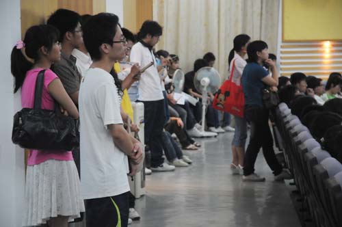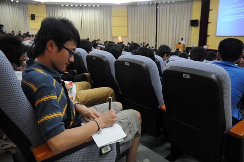 讲座现场座无虚席,不少同学甚至站着听,观众席中时有爆出热烈掌声。讲座结束后,更有许多同学上前向张汉林请教。
