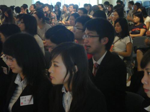 比赛的第一部分是小组成员30秒的自我介绍。在这个环节中,每个选手都要自信地介绍自己,其中一位选手以“头顶蓝天,脚踏大地,我就是一个对工作有着无比的热情然后脚踏实地一步步地把梦想付诸行动的人”这一简洁有力的介绍赢得了观众的阵阵掌声。紧跟着的是小组讨论环节。期间,来自名企的HR们纷纷离席,认真观察各成员的表现情况。其中,第一小组的成员由于观点各异,一度令讨论陷入僵局。眼看时间一点一滴的溜走,选手们理清了思路,通过投票来作出选择。尽管事后评判对此做法并不赞同,但第一小组最终还是有条不紊地作出了团队的选择并完成了presentation。