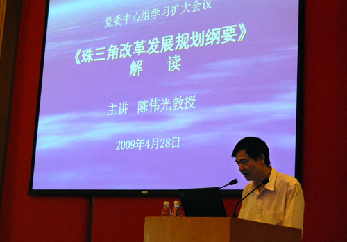 本网讯 4月28日下午,党委中心组学习扩大会议在北校区国际会议厅举行。会上,校党委常委、副校长陈子锐就如何做好维护稳定工作作了简要的汇报。随后财院院长陈伟光则从背景、基本框架与内容、宣传与实施要求三个方面详尽地解读了《珠江三角洲地区改革开放发展规划纲要(2008---2020年)》(以下简称《纲要》)。