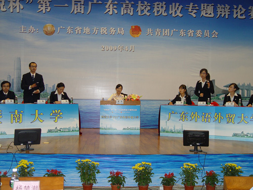 本网讯 4月22日下午,“地税杯”第一届广东高校税收专题辩论赛战火重燃。针尖麦芒,旗鼓相当,在暨大管理学院一楼报告厅内,围绕“金融危机蔓延的情况下中国政府是否应该减税”这个论题,我校代表队与暨南大学代表队展开了激烈的辩论。