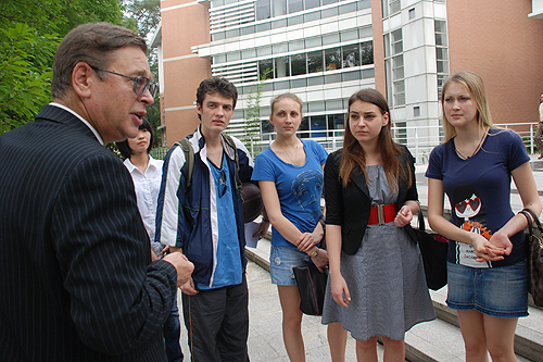 在焦方太的陪同下,总领事一行参观了我校的文化广场及图书馆,并与我校俄罗斯留学生亲切会面。