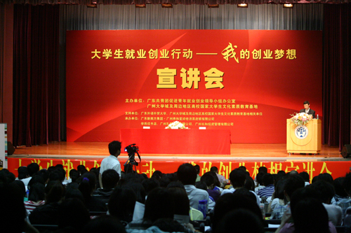 本网讯 “在就业低潮中如何迈出创业的第一步?”为了使大学生对创业有更深的认识,4月16日下午3点,大学生就业创业项目首场宣讲会“大学生就业创业行动——我的创业梦想”在我校南校区B8学术报告厅举行。本次宣讲会由广东共青团促进青年就业创业领导小组办公室、广州大学城及周边地区高校国家大学生文化素质教育基地主办,广州养和堂邓老凉茶连锁有限公司、学而优书店、广州礼都礼品有限公司、广州长和投资管理有限公司承办。