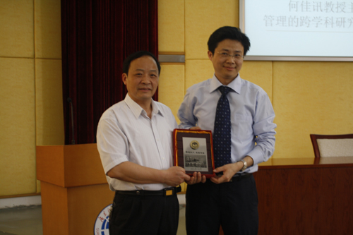 本网讯 4月16日,著名教授论坛第九十六讲——“品牌科学发展中的五大经典领域”在南校八角楼开讲。讲座由华东师范大学何佳讯教授主讲,新闻学院院长郭光华主持。校人事处副处长谢文新、管理学院院长杨晓燕、新闻学院广告系主任刘超及新闻学院、管理学院的部分师生参加了本次讲座。郭光华代表新闻学院向何佳讯赠送了纪念品。