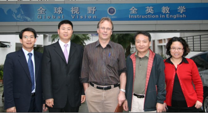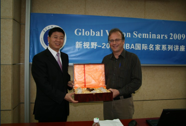 本网讯 4月6日,我校MBA教育中心“新视野—2009MBA国际名家系列讲座”第四讲“金融危机下的创新与企业家精神”在六教103课室举行。讲座由英国考文垂大学商学院副院长Dr Donald Finlay主讲,我校MBA教育中心主任助理马绍壮主持,MBA教育中心主任孙建军、副主任吴易明出席了讲座。当天虽正值国家清明节假期,但仍吸引了众多学生前来,现场座无虚席。讲座开始前,孙建军向Dr Donald Finlay赠送了纪念品。