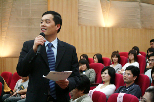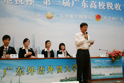 广东地税局党组成员、副局长揭晔,广东地税局党组成员、副局长刘小涛,广东地税局办公室主任王永民等领导莅临了现场。广东商学院团委书记罗贤甲、广东商学院财政税务学院党总支书记胡卫标、暨南大学社科部教授高雄飞、华南理工大学政治与公共管理学院教授黄建榕等兄弟院校嘉宾到场观战。我校团委书记刘志军、国际工商管理学院党委书记刘祎、副书记朱珍葶出席了此次活动。刘志军发表讲话,揭开了辩论赛的序幕。