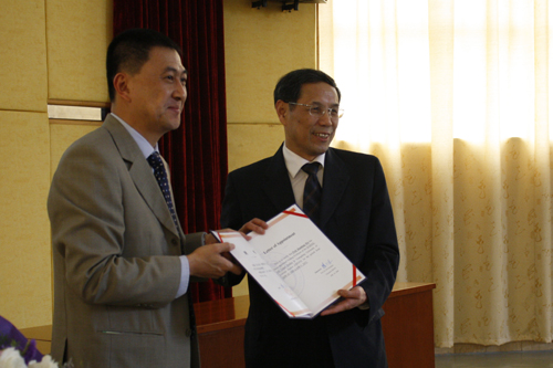 讲座开始前,主持人宣布我校聘请吴汉东为客座教授,由校长隋广军向其颁发了证书。此时吴汉东提及自己留学美国前在广外就读的经历,博得现场观众的热烈掌声。