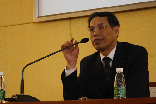 本网讯 4月9日下午两点,“著名教授论坛”第九十四讲在南校八角楼举行。讲座由中南财经政法大学校长吴汉东主讲,我校副校长石佑启主持。校长隋广军,校人事处副处长李悦明,法学院院长蔡振顺、院党委书记金良成等领导作为特邀嘉宾出席了本次讲座。