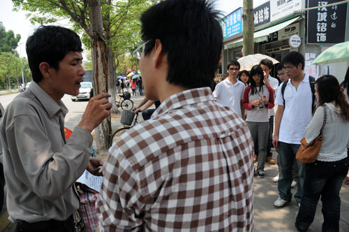 对于卫德瑞的“口哨行动”,在场的大学生反应不一,有人笑称“有病”,有人叹道“佩服”。来自我校经贸学院的傅同学表示,卫德瑞的执着确实让人感动,但是仅靠捡废品就想走遍全国,这样的想法太不现实。另外,路途中还有可能发生危险和意外,所以说“尽管他的目的明确,但前途渺茫”。商英学院的张同学也认为,大学生应该要理智爱国,爱国护国可以从日常生活里的点点滴滴做起,不一定非得是惊天动地的壮举。