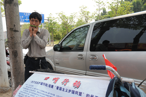 本网讯 4月11日下午,贝岗街上出现了一名男子,他用树叶做口哨,吹奏一支支爱国歌曲,身旁是一张“口哨行动”——关于发起护国行动的宣传海报。此举吸引了不少路人围观,本网记者也赶到现场一探究竟,并与该男子进行了交谈。