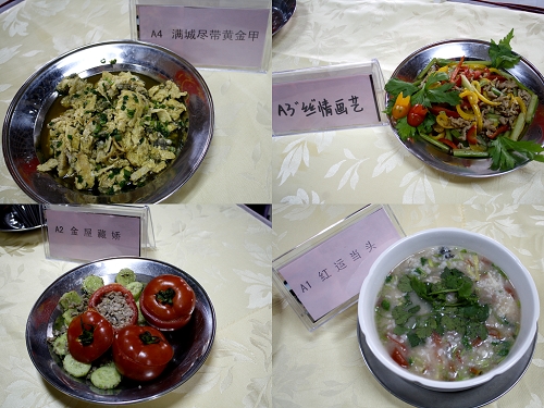 选手们的独特创意在接下来的作品中愈发体现,作为评委的两位饭堂师傅对此也是赞不绝口。来自信息的一支参赛队伍将西红柿挖空,然后填入肉馅等原料,名曰“金屋藏娇”;由信息和新闻组成的一支队伍带来的“腐乳鸡”,盘中以胡萝卜造型,摆出“信”“新”二字,另在盘外饰以刻有“信”“新”二字的塔状装饰;另一支参赛队伍则将黄红柿子椒、西芹、猪肉切成丝状以大火快炒,并用小西红柿雕出两只可爱的小兔子作为点缀,色泽明亮,可谓是“丝情画意”。五位大一女生带来的“莺红柳绿”,将洋葱、牛肉、青红椒放在一起快炒,以生菜、番茄做配菜,佐以黑椒汁,巧妙装盘,色彩鲜艳,口感爽滑。
