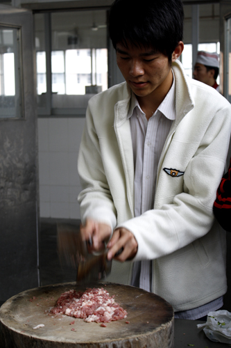 根据比赛规则,参赛队伍必须在30分钟之内完成菜品。来自信息学院大一的黄同学为赶时间,两手分别握着一大一小两把菜刀剁肉。从未下过厨房的他大呼剁肉的感觉“很爽”。相比剁肉,萝卜雕花更具难度。这边的两个女生小心翼翼地用剪刀剪出花形,那边的男生由于手头工具有限,不得不用勺子在萝卜上做起了“细活”。一位专心致志在萝卜上刻字的男生被观众指出字刻错的时候,无奈地笑道:“在萝卜上刻字和用笔写字的感觉太不一样了!”