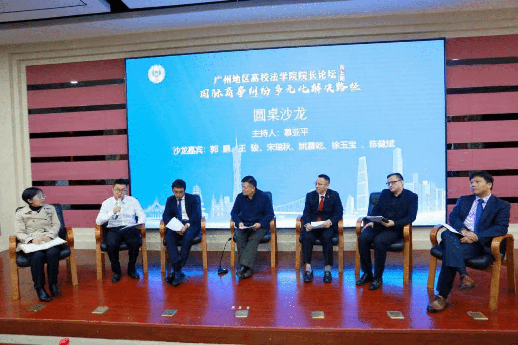 本网讯 12月6日,广州地区高校法学院院长论坛(第五期)在广东外语外贸大学南校区C座201室举办。本次论坛的主题为“国际商事纠纷的多元化解决路径”。广州市委常委、政法委书记、广州市法学会会长谢晓丹,我校校长石佑启出席论坛并致辞。来自市委政法委、市直政法各部门、广州仲裁委、广州互联网法院、广州海事法院、市律协、各区政法委的相关负责人,我校法学院、华南理工大学法学院、华南师范大学法学院、广州航海学院等高校的师生代表约300人参加此次论坛。