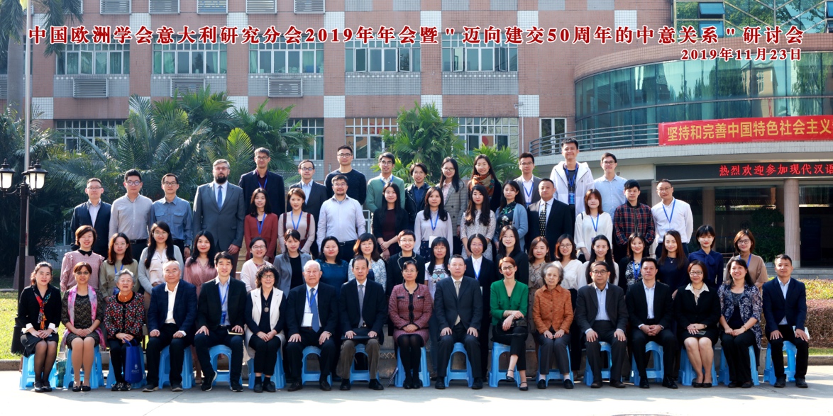 本网讯 11月23至24日,中国欧洲学会意大利研究分会2019年年会暨“迈向建交50周年的中意关系”研讨会在我校举行。本次研讨会的主题是“迈向建交50周年的中意关系”,共分 “政治与经济视角”、“科技与文化视角”和“当代意大利内政外交走向” 三个环节。全国政协外事委员会委员、中国驻意大利前大使李瑞宇,外交部行政司前司长、中国原驻米兰总领事馆总领事陈宝顺,外交部原驻米兰总领事馆领事沈亦缘、我校副校长王廷惠出席开幕式。