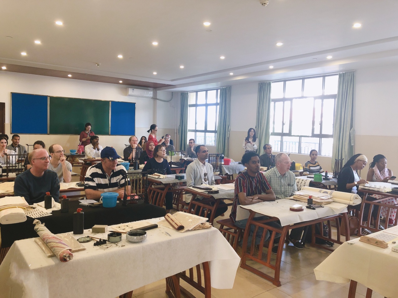 在随后的外教文化课中,外教们的角色迅速从“老师”转变为“学生”,认真聆听老师讲解中国传统文化艺术——版画和书法,接受中华传统文化的熏陶和洗礼。来自印度的智辉老师折服于中华文明的博大精深,自己也有模有样地写起了书法。其他外教们也认真地在老师的帮助下雕琢细刻,体验版画制作的整套流程,并自豪地为自己的作品署名。