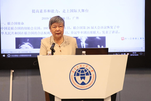 本网讯 10月26日晚,我校国际组织专题讲座课程在北校区六教A209、南校区E301开讲。主讲人是联合国大会和会议管理部文件司中文处原处长、中国外交部翻译室原主任、全国翻译资格(水平)考试英语专家委员会资深专家、中国翻译协会常务理事(专家会员)、中国前驻特立尼达和多巴哥共和国大使徐亚男。国际组织专题讲座是由教务处牵头组织推动落实的第一门国际组织特色课程;由有丰富国际组织工作经历和招聘经验的专家作时长三小时的“第一讲”;“第一次”在南北校三个国际组织创新班实现南北校同步、全程互动讲座。