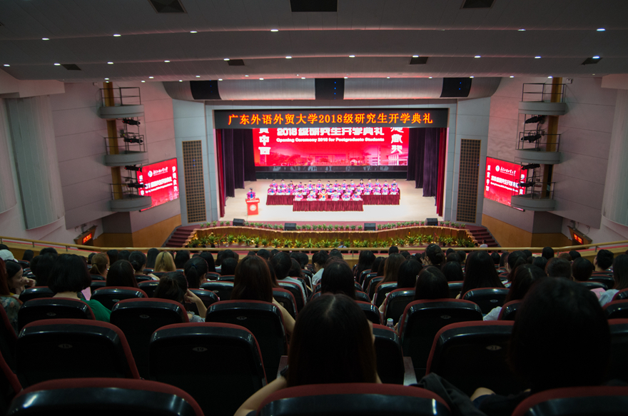 本网讯 9月11日,云山会堂座无虚席,2018级研究生开学典礼在庄严的国歌声中拉开了帷幕。校党委书记隋广军在开学典礼上发表致辞,勉励研究生新生做“勤学、立志、修德”的广外人,力求“求学精于勤”、“行事兴于志”、“做人成于德”。校党委副书记李云明,副校长何传添、刘海春、陈林汉、焦方太等校领导及相关职能部门负责人、各研究生培养单位负责人出席典礼,典礼由何传添主持。各研究生培养单位导师代表及2018级66名博士生和1269名硕士生参加了开学典礼。