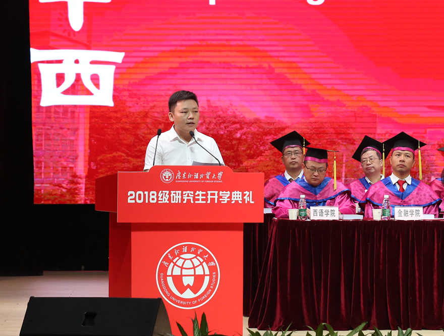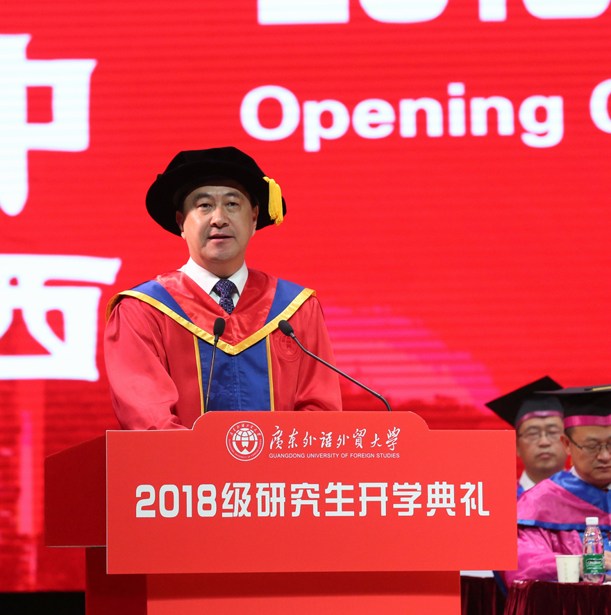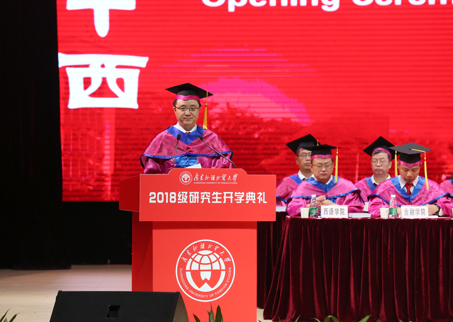 隋广军在致辞中说,研究生教育是国民教育体系的顶端,选择读研就是选择了一种超越自我的可能;广外作为一所国际化特色鲜明的高等学府,选择广外,就是选择了全球视野、国际思维,选择了优质的教育资源潜心学术、增长才干。隋广军指出,在广外,可以与学识渊博的人生导师对话;可以与蓄力勃发的有为青年同行;与包容并蓄的多元文化相伴。对于接下来在广外的读研之路,他希望18级研究生在求学、行事和做人三方面不断努力,做一个勤学、立志、修德的广外人。为此,他提出了三点要求:一是求学要精于勤,应笃学不倦,始终追求卓越。一方面,要“读书破万卷”,以“一物不知,则深以为耻”的态度,格物致知,穷理笃学,成为学识广博的通才;另一方面,要“术业有专攻”,以“钉钉子”的精神,深根厚植,久久为功,成为各自学科领域的专才。他希望同学们都能以黄建华教授为榜样,扎扎实实搞研究,勤勤恳恳做学问,将科学研究作为生活方式,把学术平台当作人生舞台,以一颗沉潜的心度过宝贵的研究生时光。二是行事要兴于志,应立意高远,胸怀家国天下。隋广军说,我们所处的新时代赋予了我们新的使命,伟大的事业需要我们更有作为的担当。他希望同学们既要着眼当下,更应放眼未来,既心系家国,又胸怀天下。抓住历史机遇,拓宽全球视野,肩负时代使命,主动把个人理想和发展融入到国家富强、社会进步、人民幸福的历史责任中,志存高远,不做世界繁荣发展的“过客”,不当国际风云变幻的“看客”,而是争当全球治理中国智慧的“创客”!三是做人要成于德,应不忘初心,涵养美好人格。无论时代如何发展,以德为先,崇德向善,始终是这个社会对人才的第一要求。我们致力培养“有德、有才、有情、有义”的广外人,将“德”字放在首位,就是要强调它的极端重要性。他希望大家在今后的学习生活中能够处处以德为先,锤炼品格,砥砺德行,在社会价值日益趋向多元化的今天,仍能够心存敬畏,坚守底线。在美好人格的涵养下,不徐不疾,恪守初心,“不在云端起舞”,而是“紧贴地面行走”,用高尚品格和真才实学做浮华时代的一股清流!