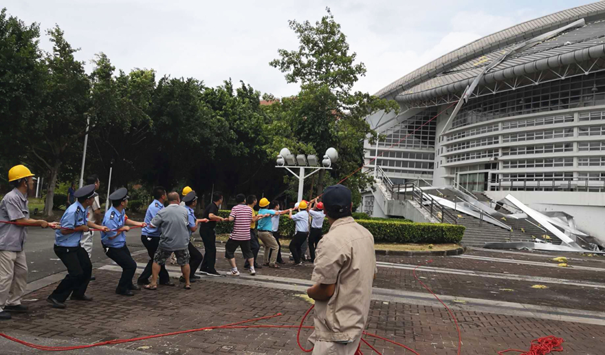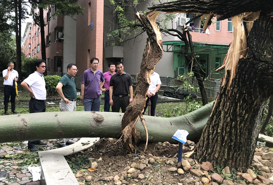 本网讯 今年第22号台风“山竹”(强台风级)于9月16日在江门台山登陆,给广州市带来强风和大雨。受“山竹”影响,我校南北校区共有148棵树被拔起、184棵树被折断,南校区体育馆部分屋顶被刮掉,北校区三处围墙被树木压倒,无人员伤亡。17日,校党委书记隋广军、副校长刘海春到校园路道、学生宿舍、食堂查看受灾情况,现场指导灾后恢复工作。据悉,目前,各项恢复工作正在紧张进行,主要道路已打扫干净,恢复畅通。