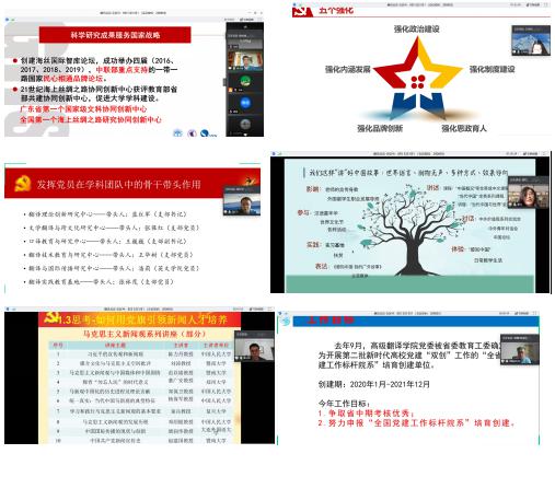 第二批“双创”全国党建工作样板支部留学生教育学院党支部书记蔡红结合疫情期间支部引领我校留学生支援中国抗疫的事迹,通过开展“感知中国”等中国国情教育活动和平台,全面讲好中国故事,培养知华友华爱华的国际友人工作情况。全国党建工作样板支部新闻学院播主与新媒体学生党支部书记黄石胜以“哪里有学生,哪里就有党旗引领”为题,分享了该支部结合学生特点,让“临时党支部”发挥大作用,通过举办“讲好广东故事”新闻调查大赛等党建活动,引领新时代新闻传播人才培养的经验做法。高级翻译学院党委书记李和民介绍了学院党委作为第二批全省党建工作标杆院系培育创建单位,今年以来成立“双创”工作领导小组,加强规范化、标准化建设,开设“广外高翻党建工作坊”微信公众号,召开混合式教学模式与课程思政研讨会,开展“一支部一品牌”线上创建活动以及“全国党建工作标杆院系”线上调研学习活动等主要工作,重点分析了与全国标杆院系的差距,进一步明确了今后学院党委推进“双创”工作的具体思路和举措。