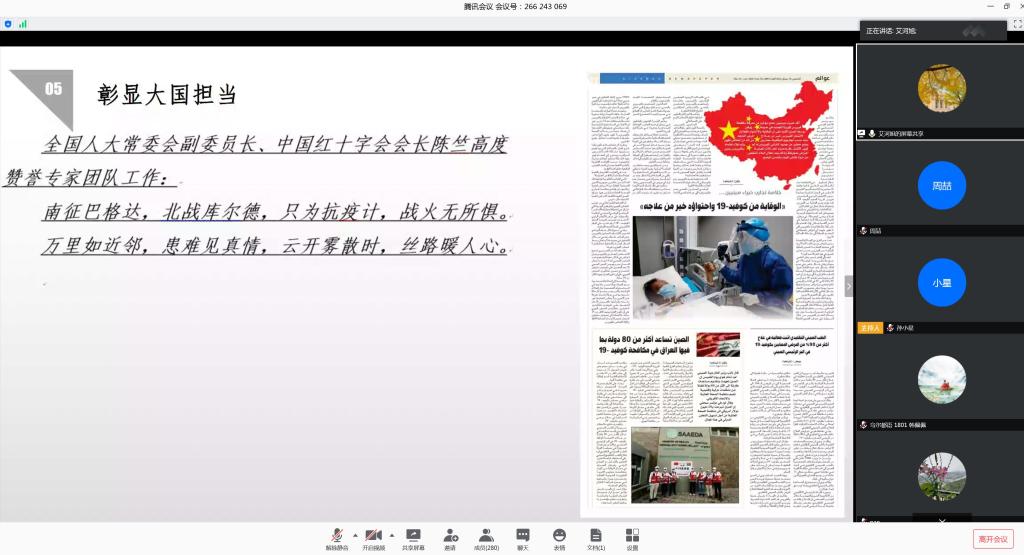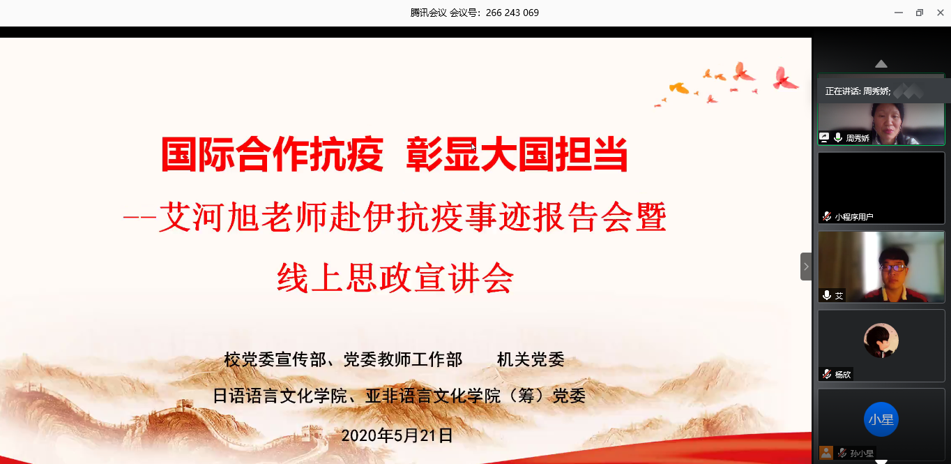 本网讯 5月21日下午,我校教师艾河旭赴伊抗疫事迹报告会暨线上思政宣讲线上举行,党委宣传部、党委教师工作部为艾河旭颁发思政宣讲团“国际合作抗疫彰显大国担当”专题特聘宣讲员证书。活动由党委宣传部、党委教师工作部,机关党委,日语语言文化学院、亚非语言文化学院(筹)主办,近300名师生党员参加线上活动。校党委常委、副校长王廷惠出席会议。