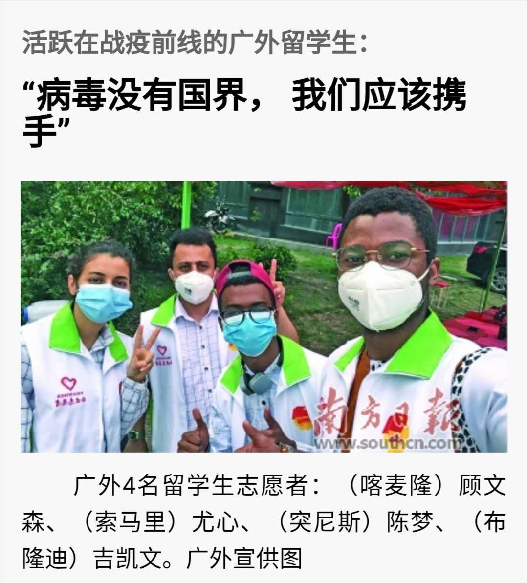 编者按:战“疫”无国界,疫情期间,我校各地留学生以实际行动支持中国抗“疫”,他们用物资万里驰援中国抗“疫”,用家书和视频为中国师生鼓舞信心,用志愿服务助力中国社区疫情防控,用切身经历为同胞解释中国的防疫政策……我校留学生向国际社会展现了“讲情义、乐奉献、有担当”的精神风貌,在共筑人类命运共同体中彰显了使命担当,在各地各界引发积极反响,被各大主流媒体相继报道。近日,《南方日报》再次聚焦我校留学生抗疫事迹,推出“活跃在战疫前线的广外留学生”深度报道。