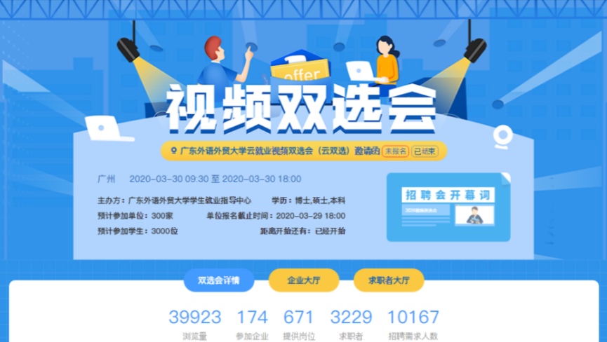 在学校组织用人单位报名参加双选会的通知发出后,共吸引了广发证券、中国银行等174家用人单位报名参会,涵盖了金融、教育、互联网、零售、制造业等各类行业。参网络视频招聘会的曹同学表示,“线上面试相比现场面试感觉更轻松些,面试过程中,面试官会问及自我认知、专业知识等方面,面试时长10分钟左右,整个面试流程都挺顺畅的。”英文学院曾同学也有同样的感受。“这种线上双选的方式很新颖,给我们提供了一定的就业选择机会。前一晚我就提前浏览了所有参会企业的信息,一共投递了7份简历,收到了3家用人单位的面试邀请,期待后面几天能够面试成功。”