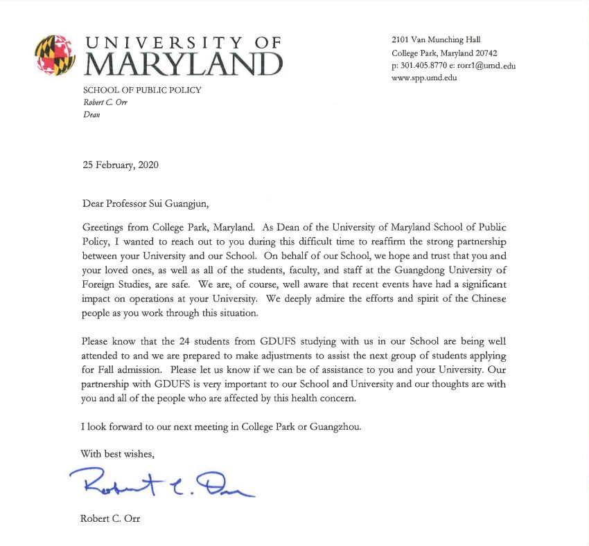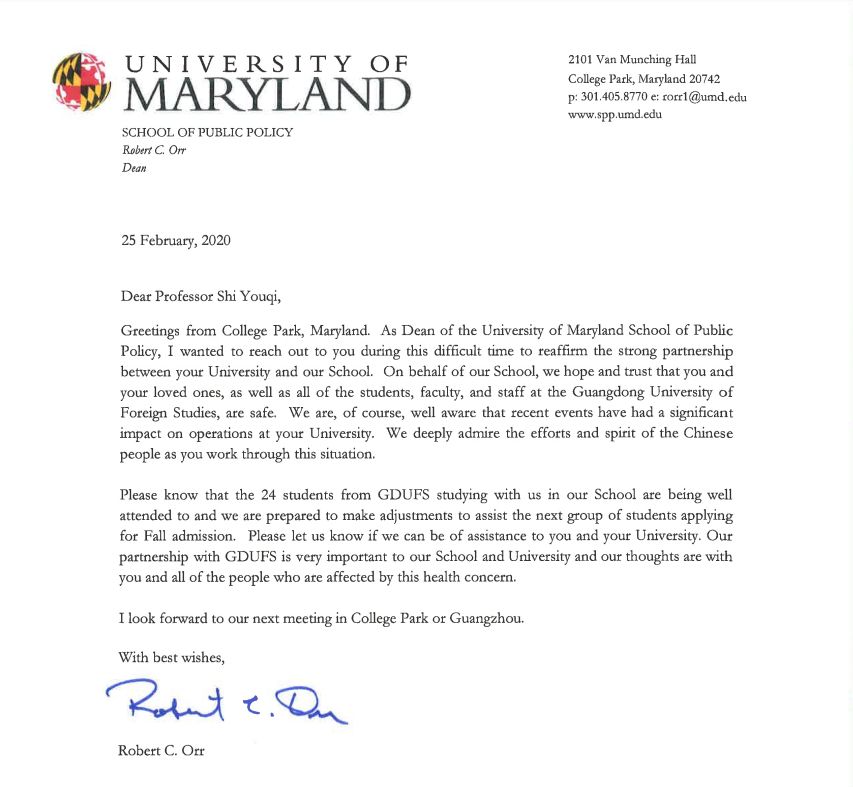 本网讯 2月25日,马里兰大学公共政策学院院长Robert C. Orr代表马里兰大学致函我校党委书记隋广军和校长石佑启,表达对遭受突发疫情影响的我校全体师生和中国人民的慰问和支持,赞扬中国人民和政府抗击疫情的精神,同时也送上真挚祝福。