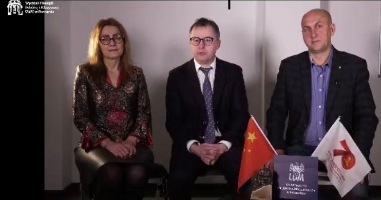 本网讯 2月20日早上,在学校紧张开展疫情防控工作之际,波兰合作院校波兹南亚当·密茨凯维奇大学发来声援视频及慰问函。波兰文学和古典文学学院院长托马什·米泽尔凯维奇(Tomasz Mizerkiewicz)教授、负责国内外合作事务的副院长克莉斯汀娜·皮尼昂舍克-马尔科维奇(Krystyna Pieniążek-Marković)教授、中国合作事务协调员拉法尔·蒂姆赤克(Rafał Dymczyk)教授共同录制慰问视频,表示全力支持中国防控新型冠状病毒感染肺炎疫情,关心中国师生身心健康,并对疫情结束后中波校际合作充满美好愿景。