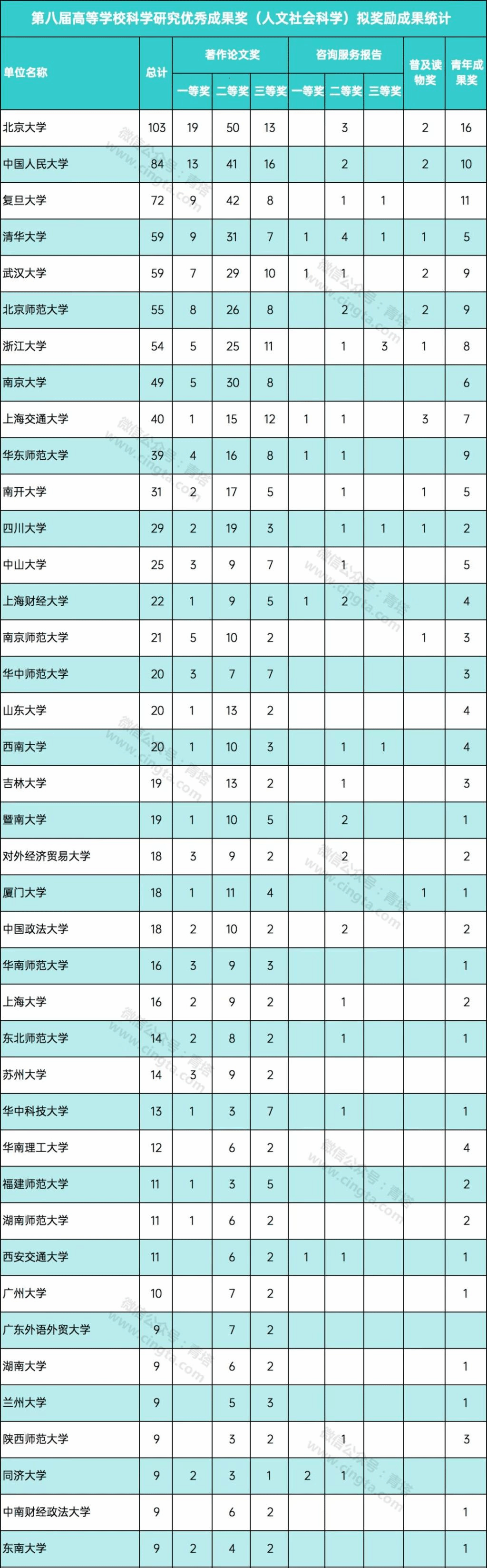 1995年,教育部设立了中国高校人文社会科学研究优秀成果奖。2008年,经国务院批准,更名为“高等学校科学研究优秀成果奖(人文社会科学)”。这是教育部为表彰奖励高校人文社会科学工作者取得的突出成绩,鼓励高校科研人员严谨治学、勇于创新、铸造精品,推动高校哲学社会科学事业繁荣发展的一项重大举措。由于组织严密、程序公正,历届获奖成果都具有较高的公信力和影响力,高校普遍将其视为哲学社会科学领域的最高奖项。