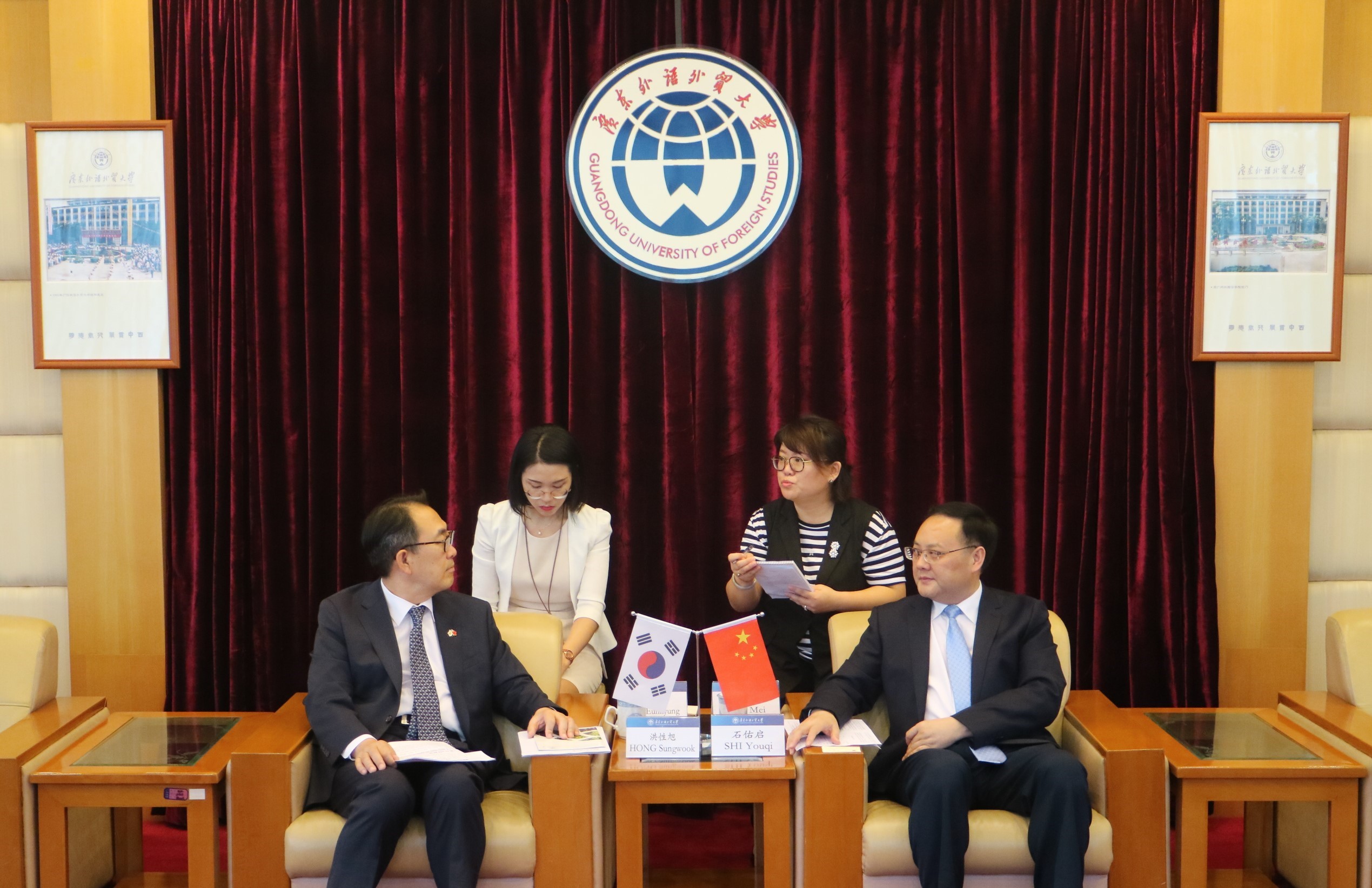 石佑启向洪性旭简要介绍了我校的办学情况。他表示,我校朝鲜语专业是教育部第一批特色专业建设点,是华南地区最早开设的朝鲜(韩国)语本科专业。近三年来,学生就业率高达100%。本学期,我校韩国留学生共103人,是我校留学生中人数最多的国家。我校已与28所韩国高校和机构建立合作关系。石佑启表示,希望双方能进一步提升合作层次,推动两国高校在学生交换、学分互认、教师互访等方面的深度合作。