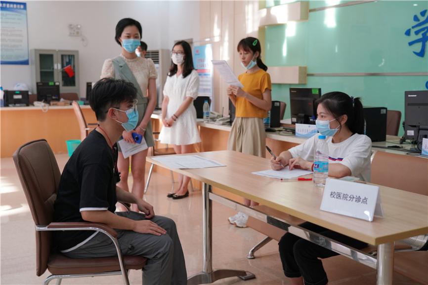 按进校流程,学校门岗设置初验区,手部消毒、更换口罩区,行李消毒区、查证区、电子测温区、复测区、学院报到区、临时观察区。返校学生入校当日,北校区学生前往北校区西小门,南校区学生前往生活区A区2号校门核验身份。经体温检测正常,出示校园卡核验身份后,前往学院报到点查验返校通行证书和绿色“粤康码”后入校。