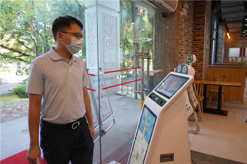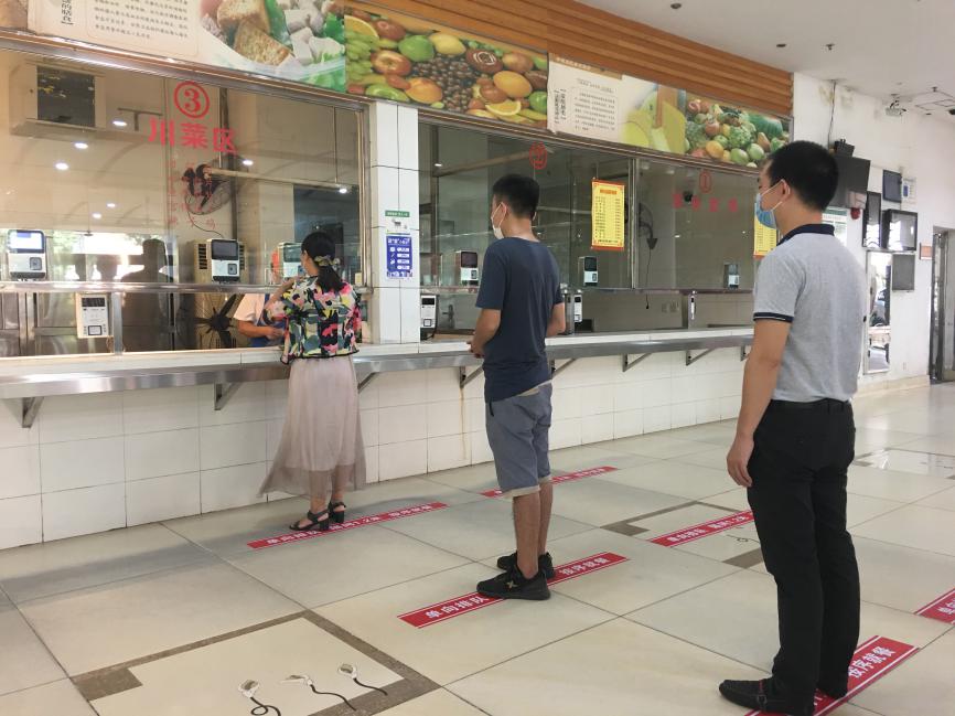进入食堂的人员需进行餐前洗手消毒。在就餐时段,入口处配置了体温测量机器人,对每位进入食堂人员进行体温检测。打餐人员排队需间隔1米,师生可以在食堂就餐,但需同向就坐。后勤处工作人员建议师生错峰就餐,自带饭盒。