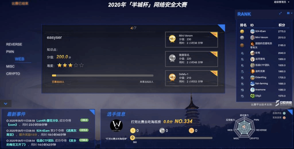 本网讯 近日,由广州市委网信办主办,我校承办的2020年“羊城杯”网络安全大赛落下帷幕。作为广州市网络安全宣传周亮点活动之一,大赛吸引了全国高校、广州市政企事业252家单位,约550支队伍、1600名选手报名参赛。