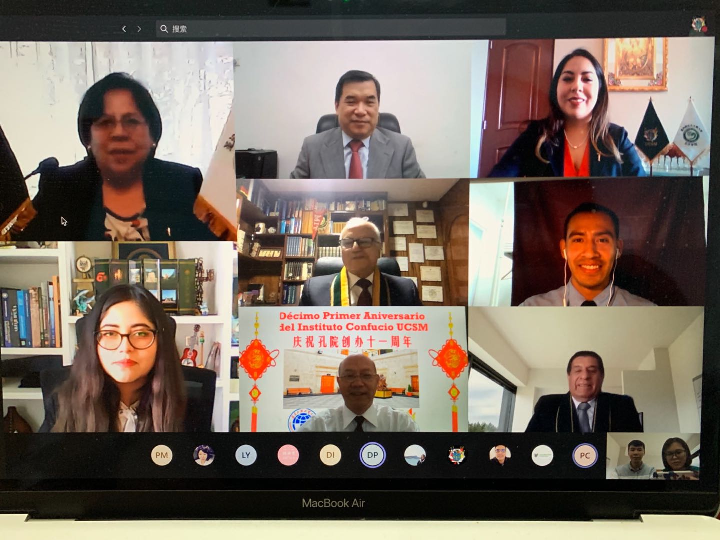 本网讯 9月27日晚上10点(秘鲁时间26日上午9点),我校与秘鲁圣玛利亚天主教大学在线上举行了圣玛利亚天主教大学孔子学院成立十一周年庆活动。我校副校长焦方太、秘鲁圣玛利亚天主教大学校长Dr. Manuel Briceño Ortega、副校长Dr. Jorge Luis Cáceres Arce、副校长Dr. Máximo Orlando Mario Rondón、副校长Dr. César Cáceres Zárate等出席活动。