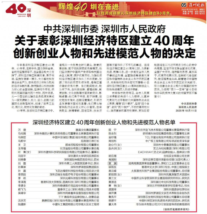 本网讯 近日,在深圳经济特区建立40周年之际,深圳市委和市政府决定对40名创新创业人物和先进模范人物进行表彰,我校校友、深圳外国语学校创校校长龚国祥位列其中。