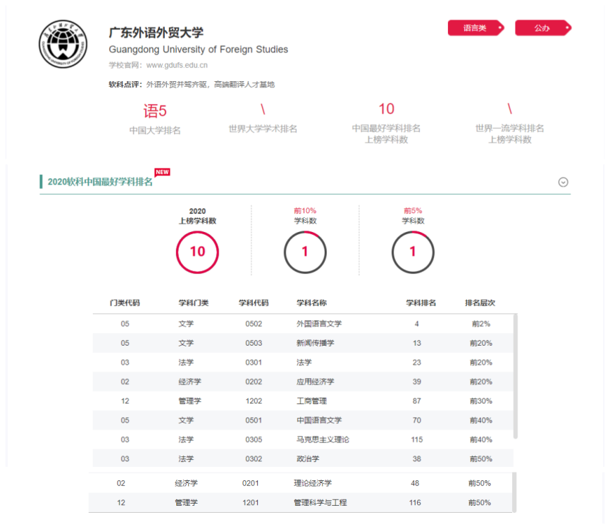 本网讯 近日,高等教育评价专业机构软科发布“2020软科中国最好学科排名”,我校外国语言文学上榜“中国顶尖学科”(排名前2%)。应用经济学、法学、新闻传播学排名前20%,另有6个学科位列学科排名前30%-50%。