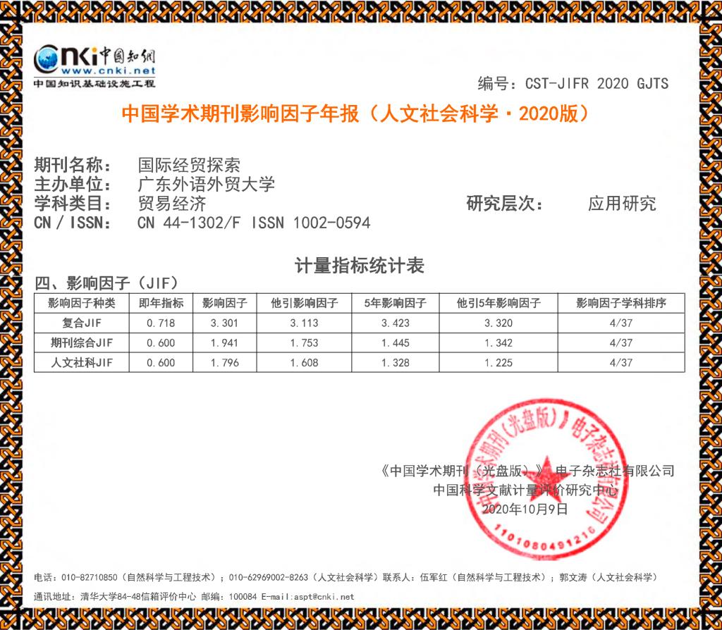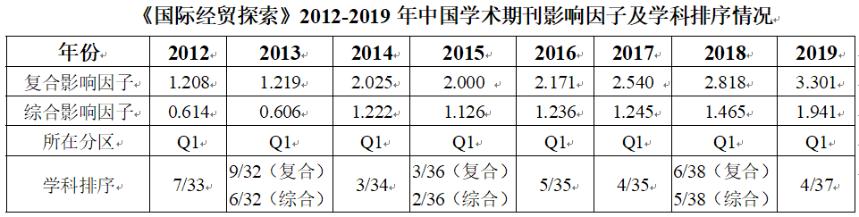 本网讯 近日,中国知网与中国科学文献计量评价研究中心联合发布《中国学术期刊影响因子年报(人文社会科学•2020版)》,我校《国际经贸探索》复合影响因子由去年的2.818上升到了今年的3.301,增幅达17.14%;综合影响因子由去年的1.465上升到了今年的1.941,增幅达32.49%;影响因子在贸易经济学科排序为4/37,连续8年进入Q1区。