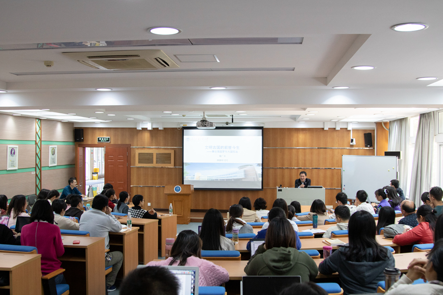 本网讯 12月3日下午,我校党委书记隋广军在北校区第九教学楼(MBA中心)103阶梯教室为我校2020级博士研究生讲授主题为“文明古国的前世今生——兼论强国梦与大国担当”的思政课。隋广军从古文明的兴盛衰亡与发展现状为切入点,深入阐释了中华民族伟大复兴强国梦和新时代的大国担当。