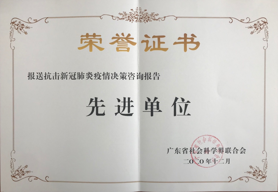 为大力弘扬在抗击新冠肺炎疫情中形成的伟大精神,充分激发全省社科工作者干事创业的责任感使命感荣誉感,凝聚起众志成城、共克时艰的强大正能量,经省社科联评选,决定对通过《南方智库专报》报送抗击新冠肺炎疫情决策咨询报告的先进单位及先进个人给予表彰通报,我校等12家单位评选为“先进单位”,我校胡文涛教授、邵任薇教授等13位学者获评“先进个人”。疫情防控期间我校新型高端智库职能表现突出,积极向《南方智库专报》报送决策咨询报告,采用批示40余份,位列全省第一。