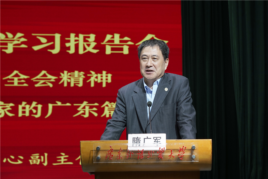 本网讯 12月24日,党委中心组(扩大)学习会暨干部素质建设大讲堂在我校北校区六教报告厅召开。省委宣讲团成员、广东省政府发展研究中心副主任谭炳才围绕党的十九届五中全会精神作专题报告。报告会由校党委书记隋广军主持,校领导,校党委委员、纪委委员,正、副处(职)级以上干部参加会议。