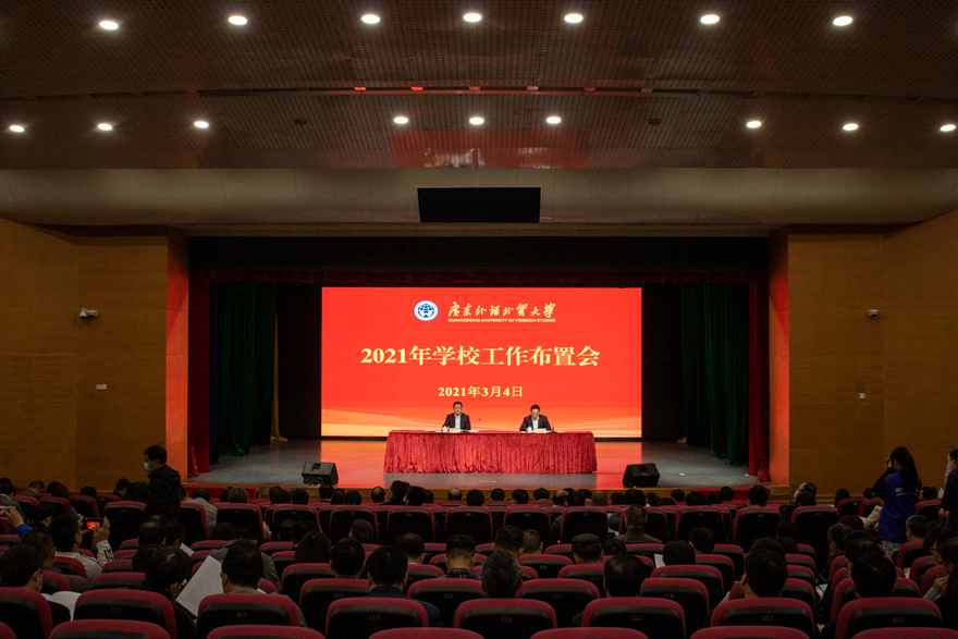 石佑启分十二个方面对2021年工作进行布置:一是抓实抓严疫情常态化防控,完善校园疾病预防控制体系;二是高质量高标准开展党史学习教育,开展迎接建党100周年系列活动;三是全面加强党的领导,推进全面从严治党向纵深发展;四是全面实施和深入落实“十四五”规划,科学谋划并推进重点建设项目;五是深入推进高水平大学建设,深化新文科、新工科内涵建设;六是持续做好国家级、省级一流专业和一流课程(金课)申报、建设、检查评估等工作,推动研究生教育改革发展;七是推进有组织的科研2.0落实落地,提升高质量研究成果产出能力;八是持续推进语言服务、全球经济治理、开放经济、区域法治与涉外法治、粤港澳大湾区建设、区域国别等领域智库建设;九是加大高层次人才引育力度,推进“成体系的教师发展2.0”建设;十是优化与国(境)外高校合作渠道,联动各方资源打造更全面、立体的孔院品牌,推进“湾区校园”等项目建设;十一是加强校园文化建设,推进北校区校门、门前广场及知识城校区等重点项目建设;十二是优化治理体系建设,增强师生幸福感和获得感。石佑启对2021年重点工作提出期望:一是要以高度的政治自觉抓落实;二是要以务实的工作作风提质效;三是要以奋进的改革精神谋突破。