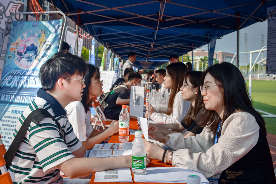 尽管烈日当空,广外学子的应聘热情不减。招聘会开始不久,许多摊位前便排起长龙,有的在热烈地讨论着企业的岗位信息,还有的仔细翻看手里的企业宣传单,以便了解招聘企业的岗位需求、发展前景、与自身的专业匹配度等信息。