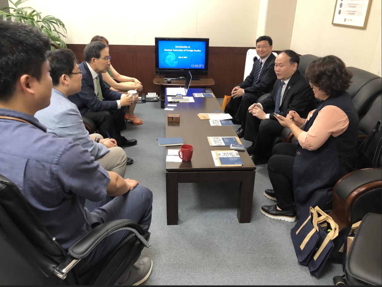 7月11日,我校代表团访问韩国外国语大学,与该校负责国际交流事务的副校长Kim Hyun Taek进行了会谈。阳爱民表示,我校与韩外自2009年签署校际合作协议以来,建立着非常友好的合作关系,我校已有多名学生交换至该校学习。在现有的基础上,双方可进一步探讨在教师互派、科研等方面建立合作与交流的可能性。Kim Hyun Taek认为双方合作应在当今国际形势顺利的前提下转型升级。双方就中、韩、日、俄四国青年领袖领导力暑期培训项目等达成初步合作意向。