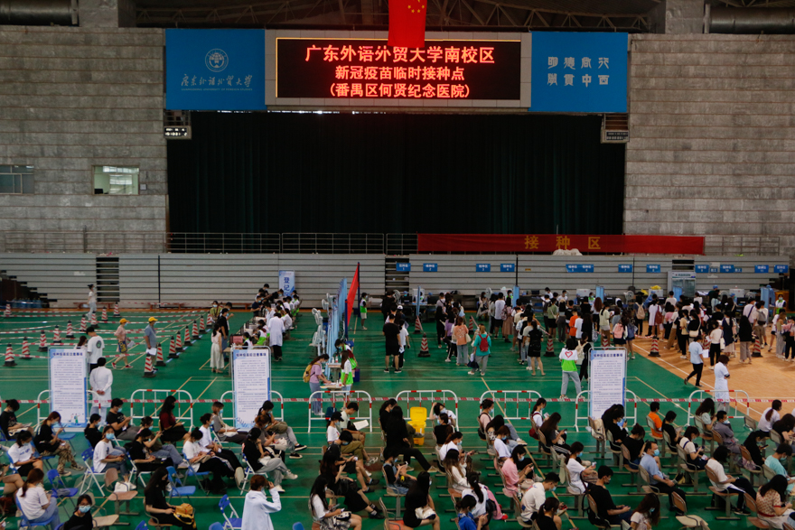 针对当广州市严峻复杂的疫情防控形势,学校及时响应、迅速部署,更加严格落实落细各项防控措施。合理布置人流动线,做好场地布置、环境消毒,对本次接种的学生和教职工“分时段、分学院、分批次”进行,师生进入等待区前严格落实亮码、测温、戴口罩等措施,合理把握人员密度,减少各环节排队等候时间。