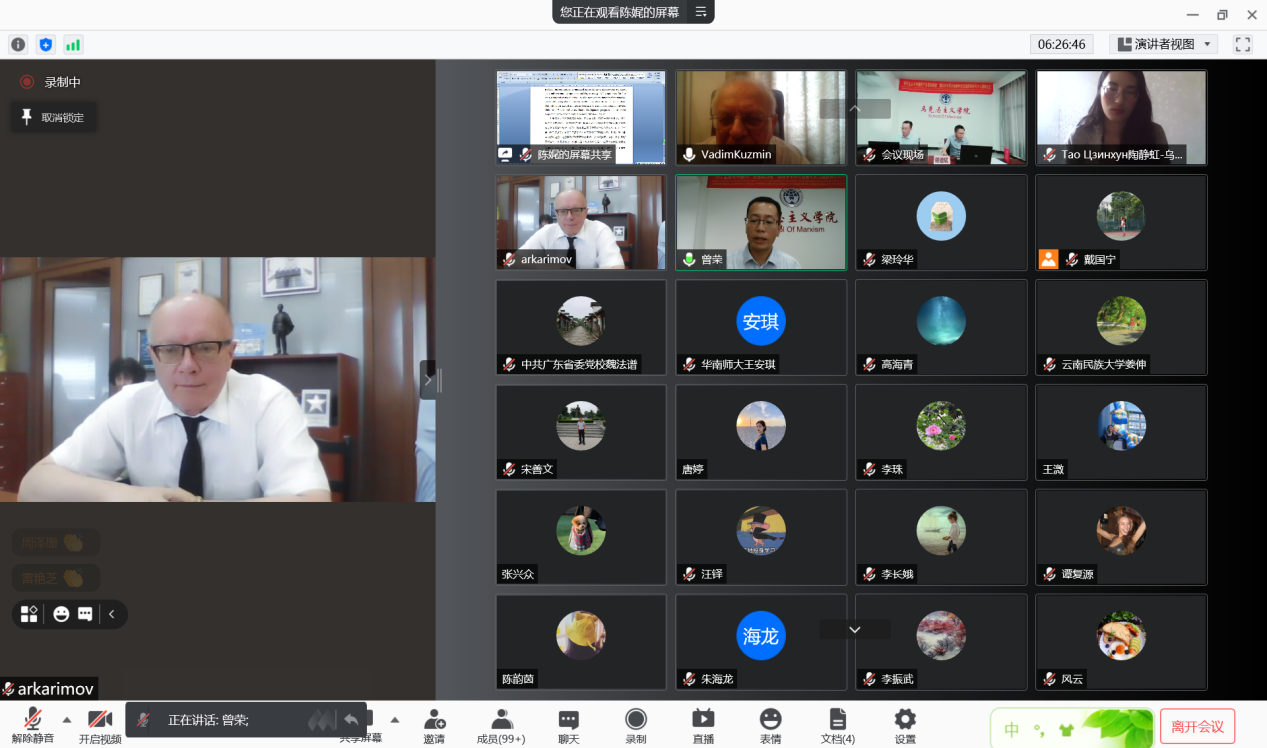 本网讯 为庆祝中国共产党成立100周年,6月19日,由广东外语外贸大学—喀山联邦大学列宁研究中心联合举办的“列宁主义与中国共产党百年历程”网络国际学术研讨会举行。同时,“党史党建教育研究中心”成立揭牌。我校副校长刘海春、俄罗斯喀山联邦大学社会哲学与大众传播学院院长谢库诺夫致开幕辞。中俄专家学者、马克思主义学院师生共230多人参加了研讨会。