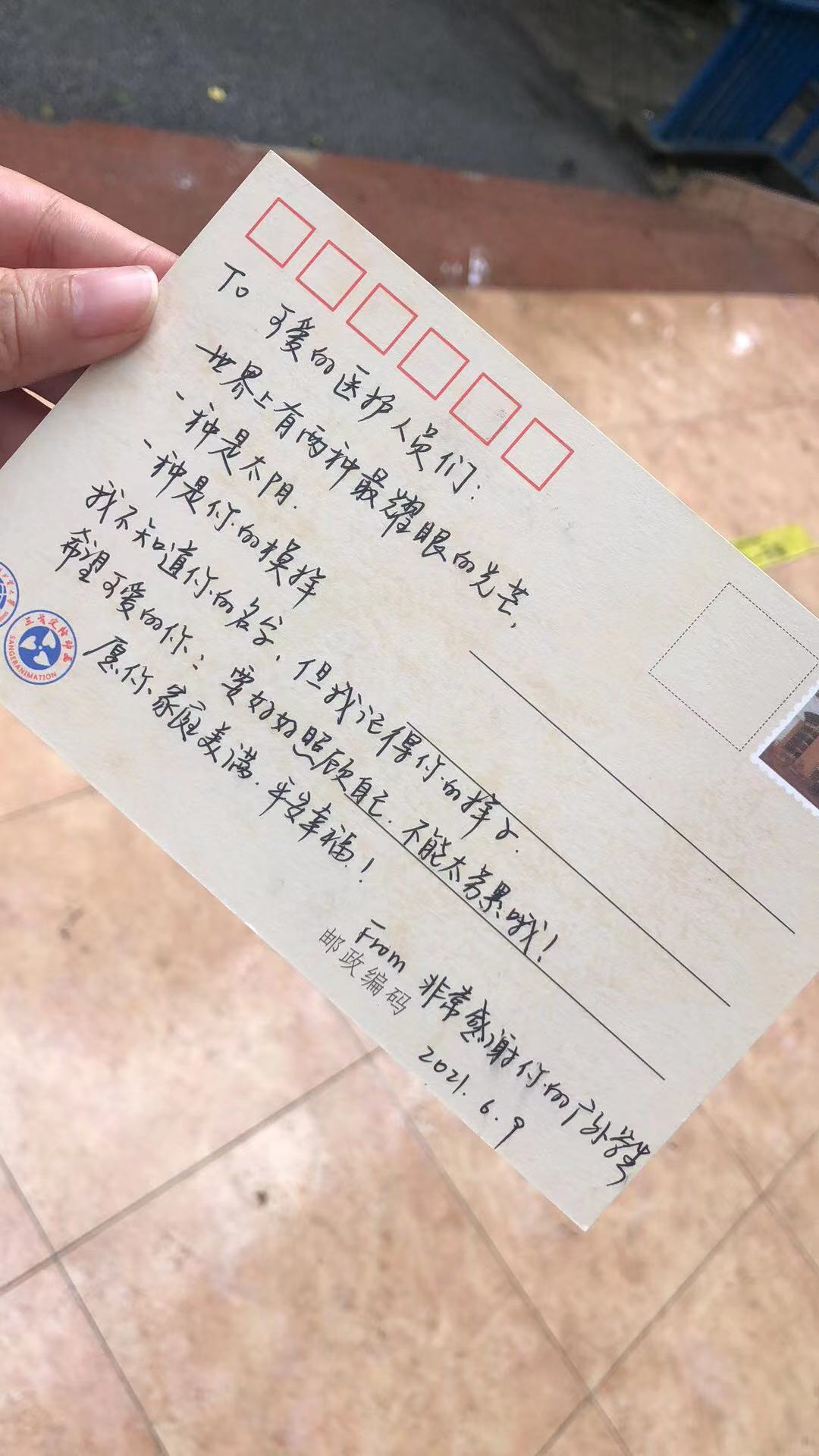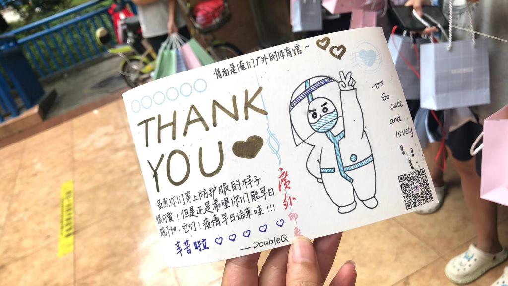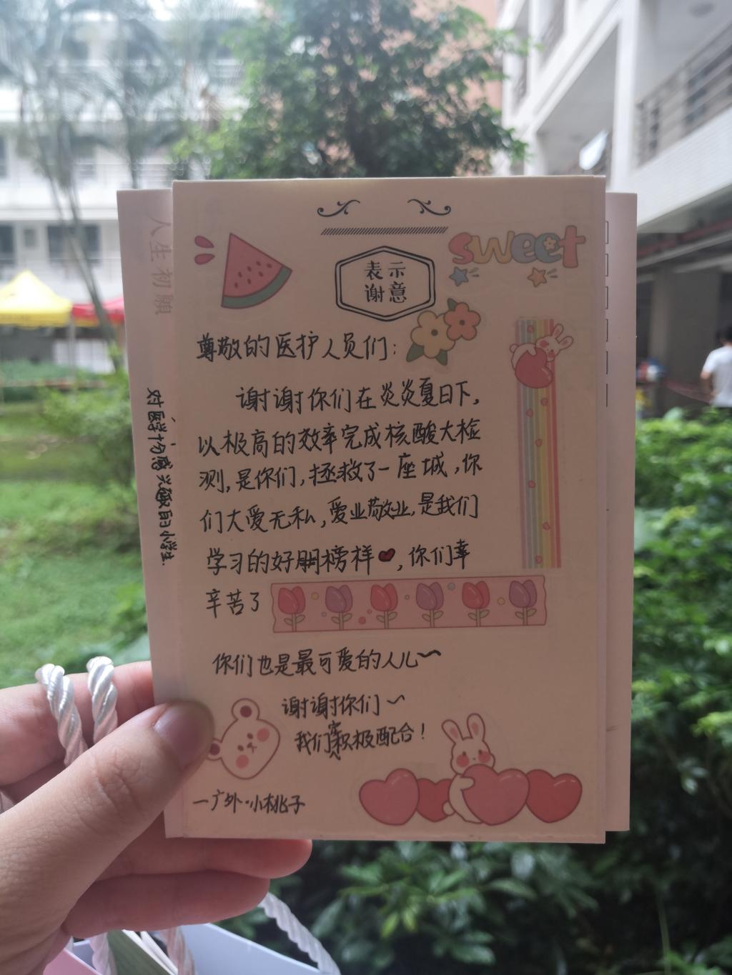 学生为感谢医务人员的辛勤付出,专门准备了自制的卡片和礼物送给医务人员。据悉,6月21日下午接到核酸检测任务后,学校连夜部署筹备工作。党办校办、保卫部(处)、学生工作部(处)、研究生院(部)、校工会、校团委、人事处、后勤处、离退处、网信中心等相关单位通力协作,密切配合,以高效率、高水平、高质量、高满意度完成三天内的两次核酸检测工作。