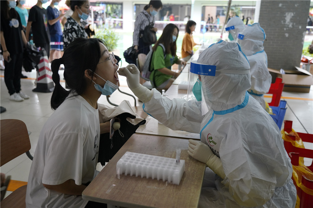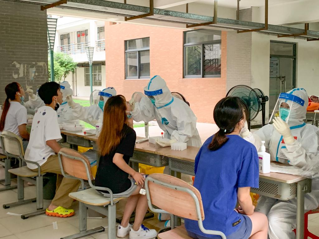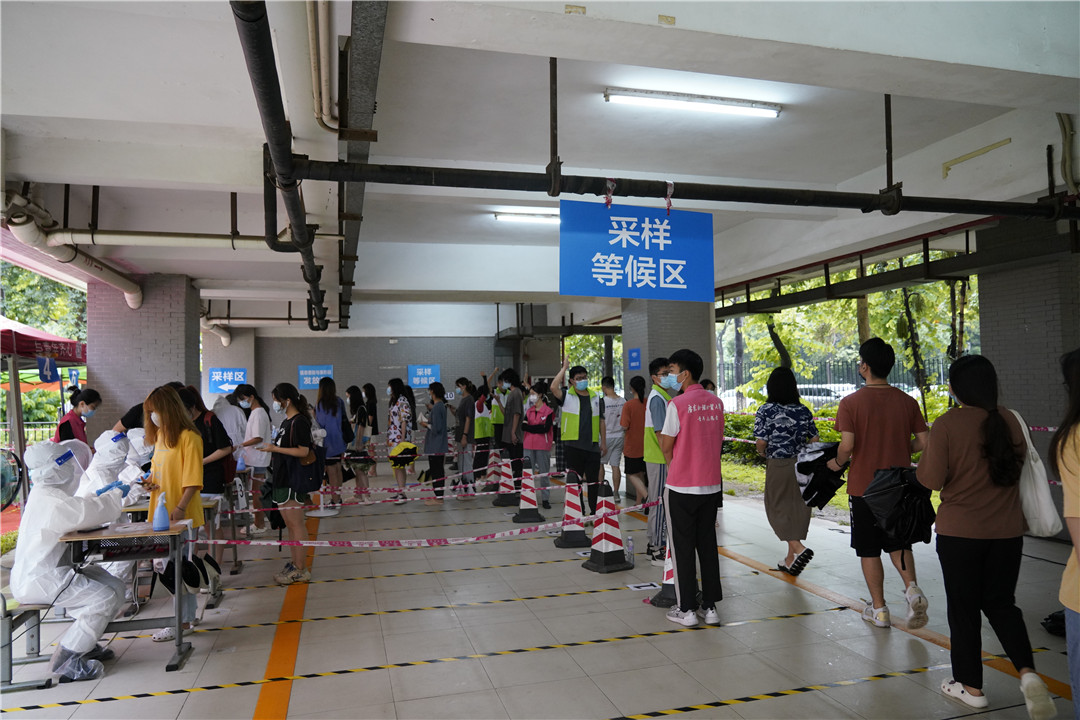 本网讯 根据疫情防控工作要求,为保障师生身体健康和校园安全,6月22日和6月24日,我校三天内配合小谷围街道两次开展覆盖南校区全体师生员工的核酸检测工作,做到“应检尽检、不落一人”,并于当日完成全员核酸检测工作。核酸检测采样在学生宿舍7、8栋架空层和11栋架空层进行。两日来,学校共组织了380余名教工党员志愿者和360余名学生志愿者参与现场志愿服务工作,全力协助核酸检测。截至发稿前,所有核酸检测结果均为阴性。