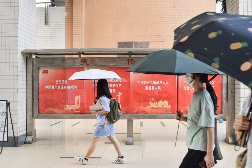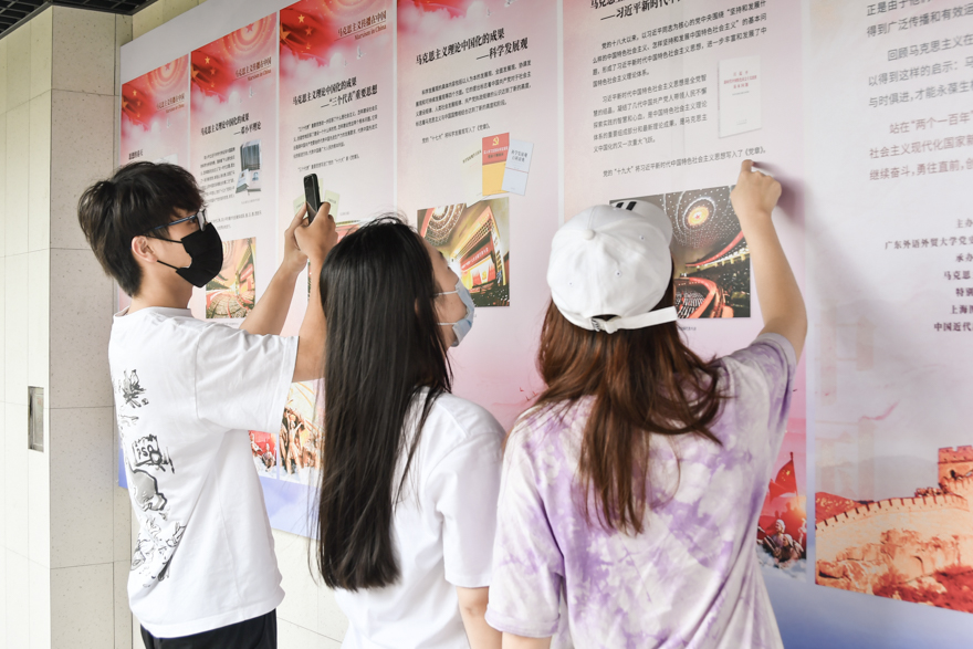 为营造庆祝中国共产党成立100周年的热烈氛围,学校在南北校区、知识城校区的校道和教学楼上挂起海报和横幅,营造了浓郁而欢庆的氛围,师生纷纷来到庆祝建党100周年立式宣传牌前合影留念。