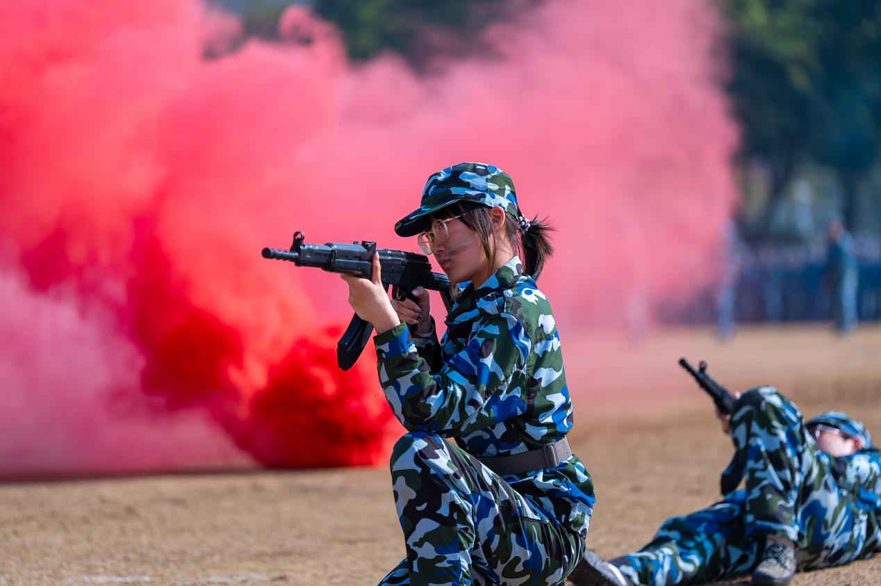 军事技能表演方阵登场,三大方队轮番展现硬核实力。棍术方阵棍棒疾舞,少年意气飞扬;大学城校区匕首操方阵如惊雷破阵,腕转刀闪,列队“GDUFS”字样造型点燃全场;擒敌拳方队拳风呼啸,一招一式刚劲沉稳。演练中,擒敌拳方队冲拳、抱腿顶摔虎虎生风,展露扎实素养;女子匕首操方队出刀迅猛、队形流畅;白云山校区战术方队更以烟雾弹、匍匐协同等实战模拟,带来沉浸式体验,尽显广外学子昂扬风貌。