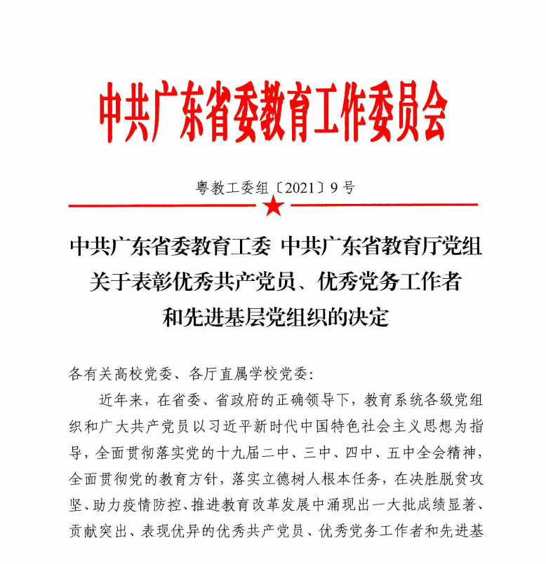 本网讯 近日,中共广东省委教育工委 中共广东省教育厅党组印发了《关于表彰优秀共产党员、优秀党务工作者和先进基层党组织的决定》。我校粤港澳大湾区研究院院长申明浩、英语教育学院副院长陈金诗被授予全省教育系统“优秀共产党员”称号,国际商务英语学院党委书记王秀民被授予“优秀党务工作者”称号,高级翻译学院党委、西方语言文化学院教师第一党支部被授予“先进基层党组织”称号。